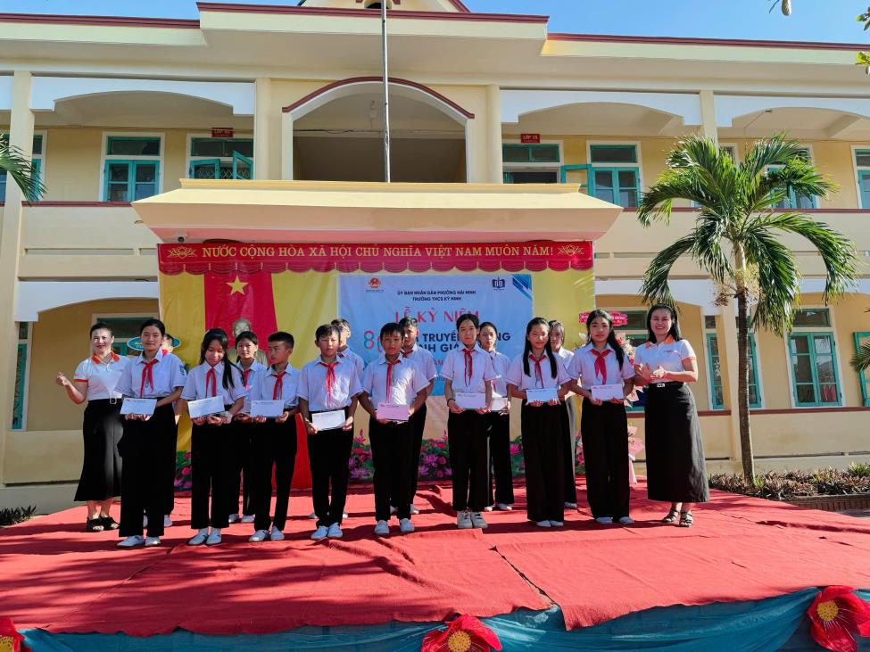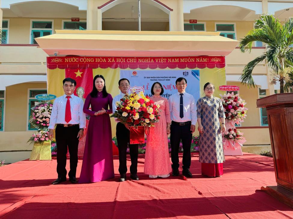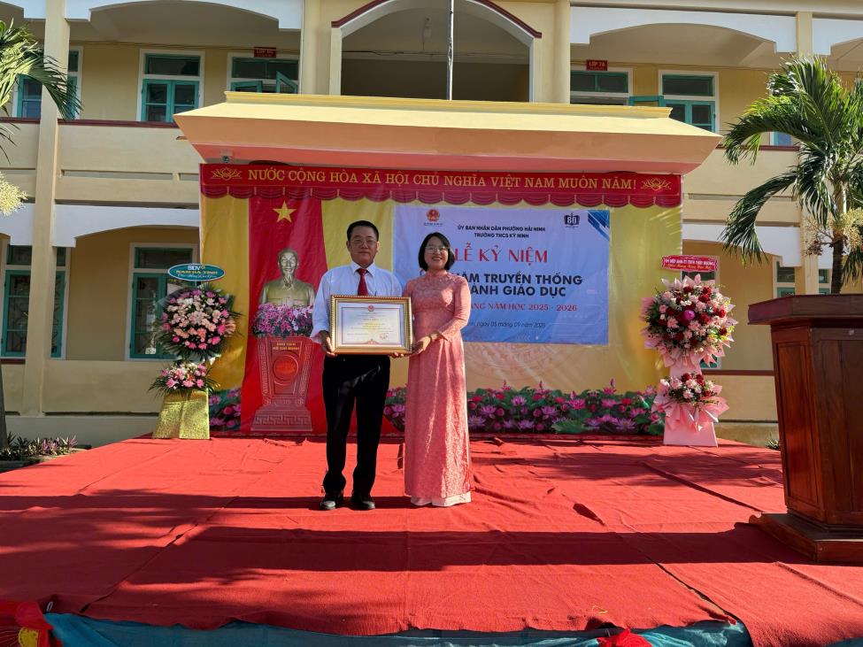 Đặc biệt, nhân dịp ý nghĩa này, Tập thể giáo viên và học sinh Trường THCS Kỳ Ninh rất vinh dự và tự hào được đồng chí: Hồ Minh Hằng - Ủy viên Ban Thường vụ, Phó Chủ tịch UBND phường Hải Ninh thay mặt cho lãnh đạo trao tặng Bằng khen của UBND Tỉnh năm học: 2024- 2025.