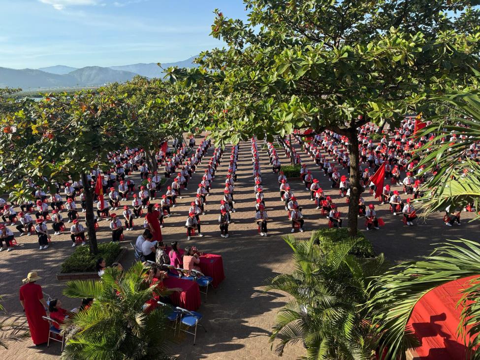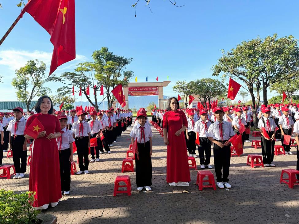 Sân trường bừng sáng sắc màu cờ hoa, ánh lên những gương mặt rạng ngời của các em học sinh trong bộ trang phục mới tinh khôi. Giây phút chào đón 142 em học sinh lớp 6 bước vào cánh cổng trường rộng mở, tràn đầy khí thế mới, vô cùng trang trọng, trên tay các em là những lá cờ đỏ sao vàng vẫy chào quý vị đại biểu và các thầy cô giáo cùng các anh chị của trường.